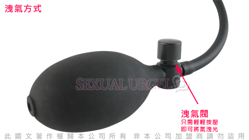 本品可以透過氣囊的作用,使後庭栓增粗,讓你根據自己的喜好自由選擇它的大小,到達高品味的渴望與需求。專為你的不同需要而設計,上窄下寬的子彈型設計,內部堅挺有力,外表面光滑柔軟、彈性十足,使用時非常順暢,精心呵護你的嬌嫩部位。氣囊的起伏讓器具更粗壯,輕按氣囊邊的小汽閥,它立刻會恢復到原始的大小,讓你自由變換大小,體驗不同方位的性愛!