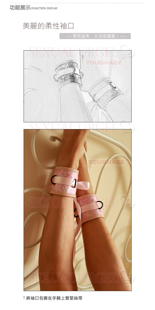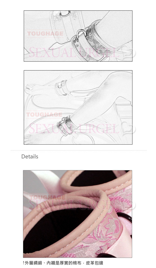 腳腕束帶由護腕和束縛帶組成。護腕內填柔性材料,徹底保護腳腕;束縛帶是一條光潔的絲帶,您可以單腳、雙腳綁縛,亦可綁縛於床頭、門窗等,總之任您發揮!Toughage用最優質的手工綢緞縫製,內襯仿皮絨,集中體現了舒適、牢固和美麗的產品要素。腳腕帶寬達3英吋(約7.8厘米),適合全部腳腕。