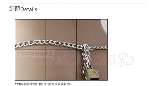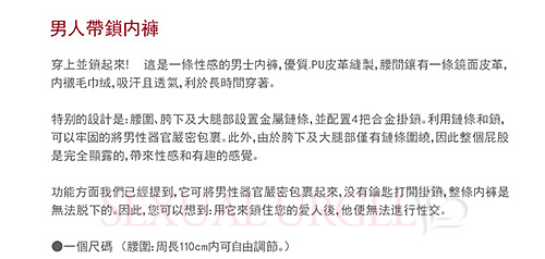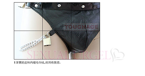 穿上並鎖起來! 這是一條性感的男士内褲,優質.PU皮革縫製,腰間鑲有一條鏡面皮革, 内襯毛巾绒,吸汗且透氣,利於長時間穿著。 特别的設計是:腰圍、胯下及大腿部設置金屬鏈條,並配置4把合金掛鎖。利用鏈條和鎖, 可以牢固的將男性器官嚴密包裹。此外,由於胯下及大腿部僅有鏈條圍繞,因此整個屁股 是完全顯露的,帶來性感和有趣的感覺。 功能方面我們已經提到,它可將男性器官嚴密包裹起來,没有鑰匙打開掛鎖,整條内褲是 無法脱下的。因此,您可以想到:用它來鎖住您的愛人後,他便無法進行性交。