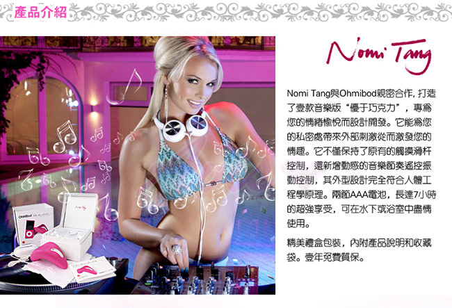 Nomi Tang 與 OhMiBod 合作製造全新動感音樂按摩器,給各位享受音樂的氣氛以外,也享受音樂產生出來的震動感。