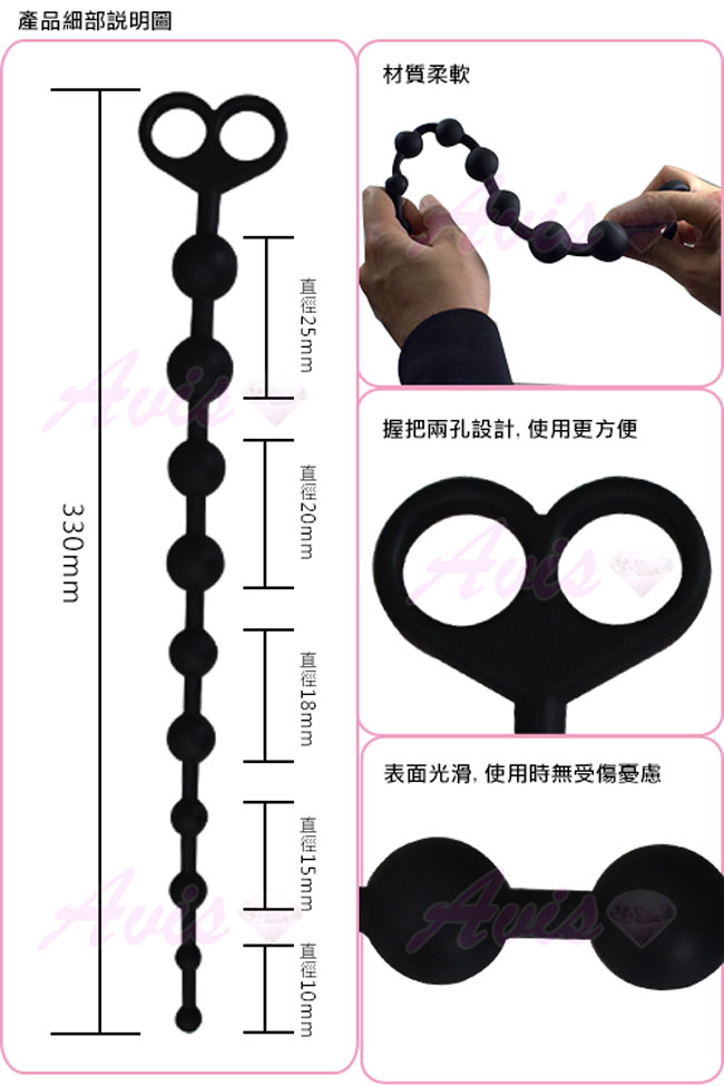 矽膠膠材質觸感柔細舒服軟硬度適中,細長型的拉珠最適合入門玩家,由小至大細長型的設計讓頭部可以很輕易的滑入肛門,進入肛門時馬上就可以慢慢感到擴約肌被撐開的快感