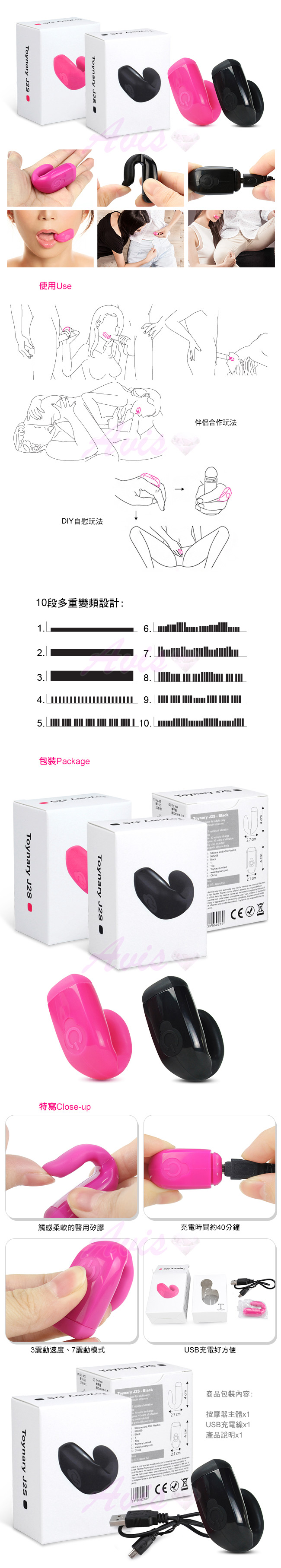 帶給男士無限快感!Toynary 的創新設計口交專用震動器 。口交前先啟動開關,再把J2S夾在口邊,口交時即可令男士伴侶感受全新的口交快感!J2S 設有3種震動速度及7種震動模式,必定能為伴侶提供至高無上的享受。J2S 設有3種震動速度及7種震動模式,舒適的震動力配上使用者的口部動作,必定能為伴侶提供至高無上的享受。採用醫療級矽膠製造,USB充電,防水。