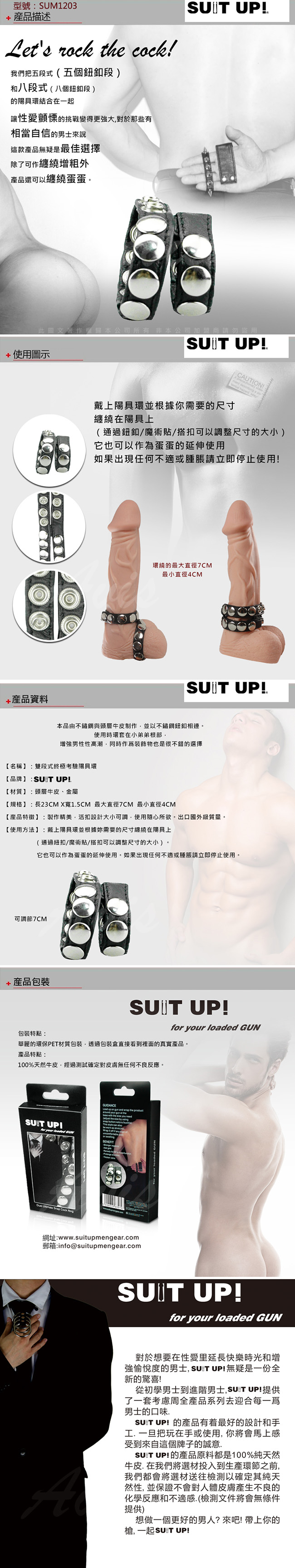 本品由不銹鋼與牛皮製作,並以不銹鋼鈕扣相連,使用時環套在小弟弟根部