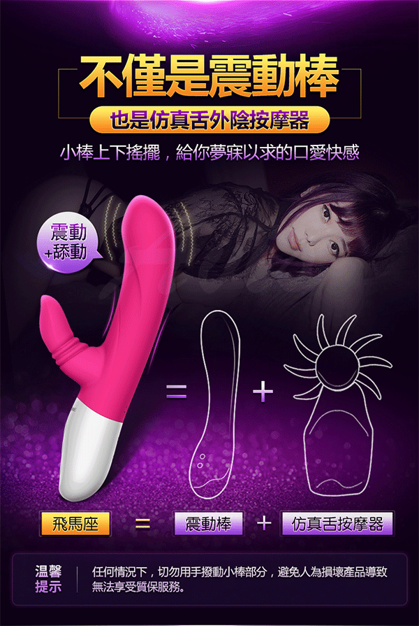 雙重馬達強勁刺激! 8X8震頻,64種挑逗模式,再挑剔的女人也能滿足!人體工學設計,貼合女性私密部位,致以貼切的愛撫,不會撐大私處。磁吸充電設計,內置高效可循環利用鋰電池,可反复充電,使用壽命長!採用防水設計,柔軟親膚矽膠,無論身處何處都可以放心和飛馬座翻雲覆雨,事後直接用清水沖洗即可!飛馬座,恰似你的溫柔!