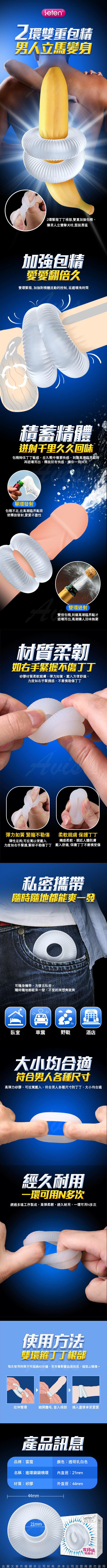 2環雙重鎖精,讓您立馬變久變硬!!雙環緊箍老二根部,雙重加強鎖精,減緩血液回流使海綿體不斷充血,讓男人立變擎天柱,堅挺勇猛久戰不洩。採用矽膠材質柔軟親膚,彈性極佳戴入方便舒適,力度如右手緊握感,不傷害肌膚。此款可隨身攜帶,方便且私密,讓您可以隨時隨地來一發,不受約束想爽就爽喔