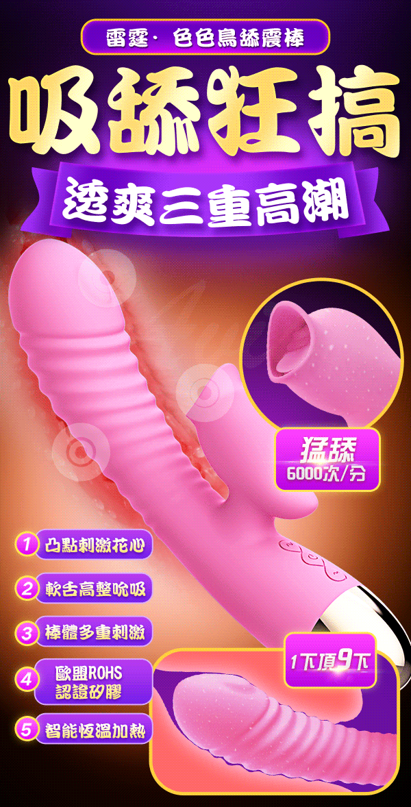 色色鳥舔震棒在口部柔唇吸吮,軟舌高速撩動及棒體多重刺激連環內外強擊下,引爆多重高潮!!採用雙層肌感矽膠,柔軟舒適又不失男根堅挺。給您逼真刺激快感。而貼心的智能恆溫加熱,接進人體溫度如同享受他的慾火,激情持續不熄。擁有防水低噪讓您邊玩邊洗體驗濕身快感,事後清洗也方便喔。