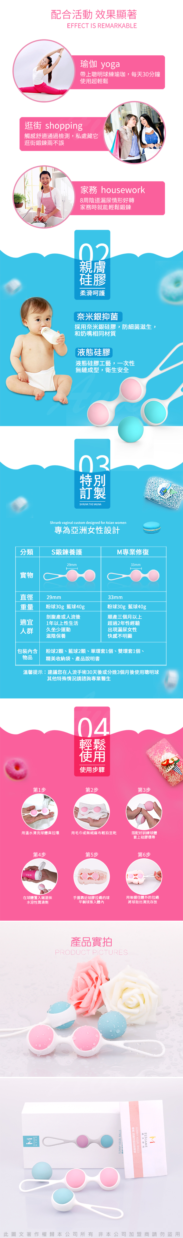 每組配有4個可交替的按摩球,2個30g的粉色球和2個40g的藍色球。一開始僅佩戴一個球(配有抽繩),然後在家中走走試試感覺吧