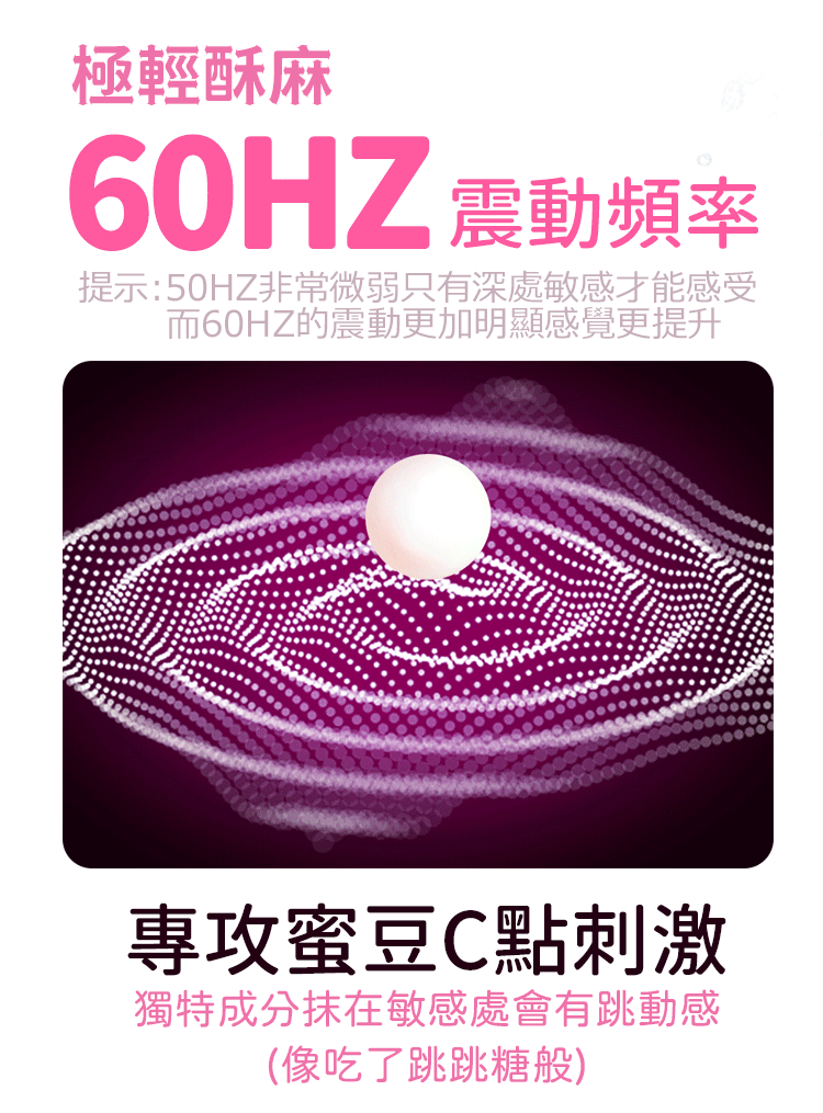 具有獨特震動感,類似跳跳糖帶給您跳動感覺,有助於女性自身分泌潤滑液。