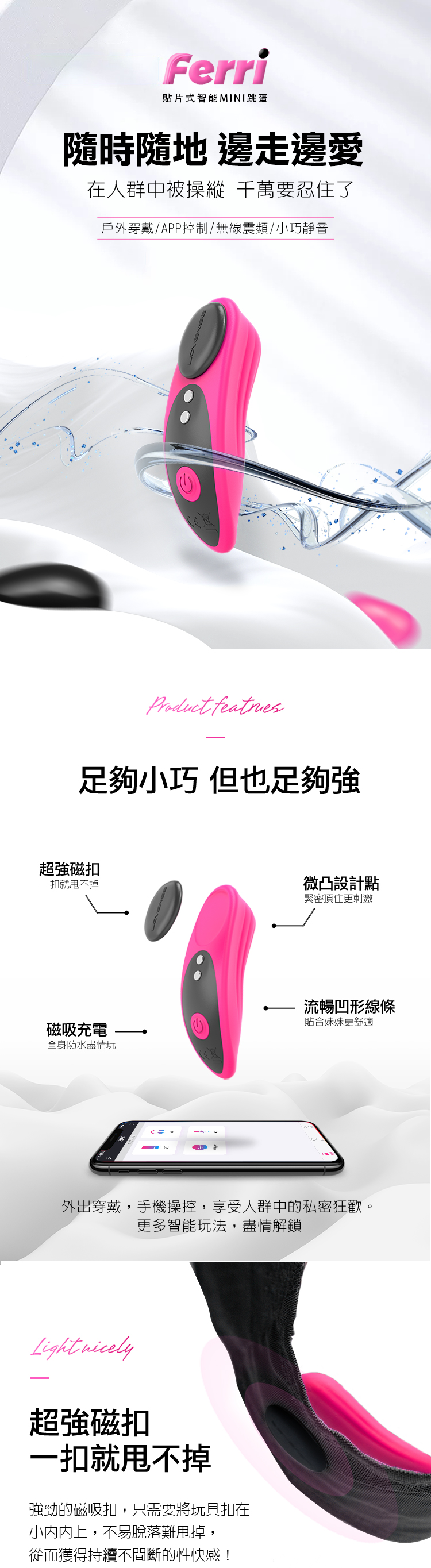超強磁扣,一扣就甩不掉,強勁的磁吸扣,只需要將玩具扣在,小内褲上,不易脫落難甩掉,從而獲得持續不間斷的性快感!