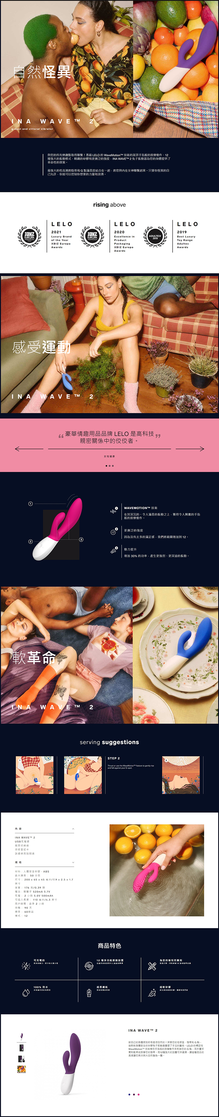藉由LELO的WaveMotion™技術而湧動的手指般按摩動作,12種強大的震動模式,精緻柔軟的矽膠以及更廣泛的強度範圍,INA WAVE™ 2 rabbit vibrator提供對妳身體的革命性探索。最強大的性高潮將陰蒂和G點滿意度結合為一,讓妳與妳的內在女神相結合。只要妳的怪異自我允許,妳就可以控制妳想要的力量及浪潮。