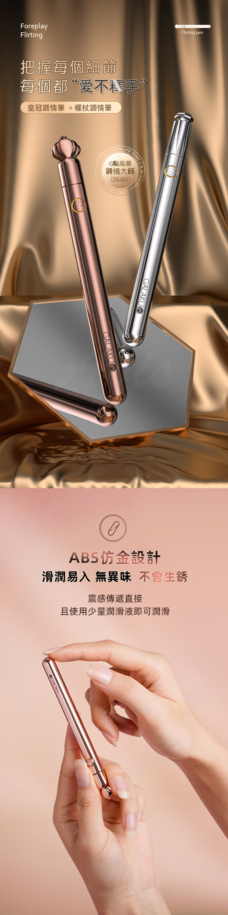 調情筆兩款可選,隨心選你所愛,權杖款、皇冠款;G點高潮,調情大師,纖細小巧,告別粗暴開肛; 全包圍ABS設計,滑潤易入無異味,不會生鏽,震感傳遞直接,且使用少量潤滑液即可潤滑,圓潤精準深入,直抵"深處噴潮",10頻強震即觸"酥麻酸爽"從漸入佳境到如醉如夢抵達魂巔享受。