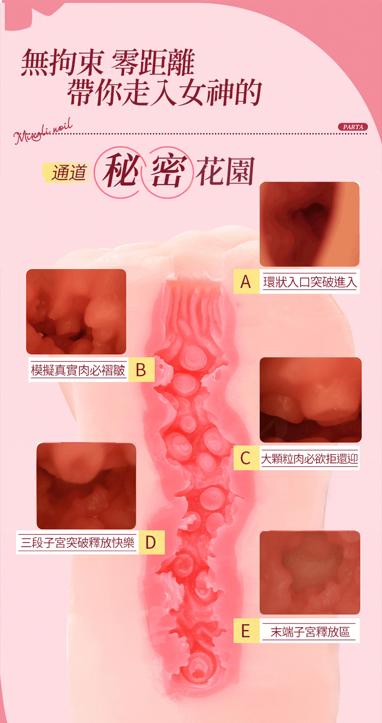 前段螺旋構造,中段突起肉球與肉芽磨擦攻擊,尾端子宮區強力吸吮