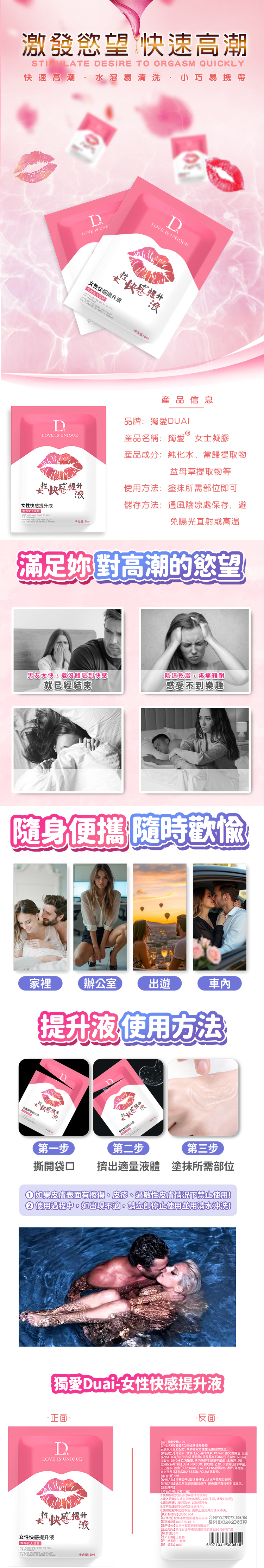 商品名稱:獨愛女性快感液 8ml成分:純化水、甘油、卡波姆、羥乙基纖維素、丙二醇、植物提取物等容量:8ml保存期限 兩年